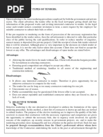 Open Tendering: Allows any contractor to submit a tender to an advertised project Process: o Client advertises openly in the press/ trade publications inviting contractors to apply o Contractor that is able to undertake project would request for a tender document o After receiving the tender, the contractor may be required to give a deposit and to ensure a bona fide tender. This is done to filter out uninterested contractors. Advantages: o Maximum/high level of competition; contractors quote their best prices o Lowest price quote is obtained Disadvantages: o Large waste of efforts because too many contractors are tendering o Contractor submitting lowest tender may not be properly equipped to undertake the contract o Client may be inclined to accept lowest tender irrespective of reputation of contractor o Poor quality building or bankruptcy may occur
