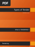 at a specified cost and in specified time with a set of requirements or specifications) from prospective tenderers in the specified tender form (RFP). Bid: A bid is a quoted tender either in the specified form of the employer or contractor. Bidding is an offer(often competitive) of setting a price for specific work or service to be provided. Tendering is the process by which bids are invited from interested contractors to carry out specific packages of construction work. Tendering should adopt and observe the key values of fairness, integrity, honesty, clarity, simplicity and accountability keeping in mind the value for money. Three Types of Tendering Methods used in Construction Industry: 1. Open Tendering ( Competitive) 2. Selective Tendering(Competitve) 3. Negotiated Tendering Competitve Tendeirng: Invites contractor to submit the lowest price for which they are willing to carry out a project. Relies on information contained in drawings, specs, and BOQ prepared on behalf of client.