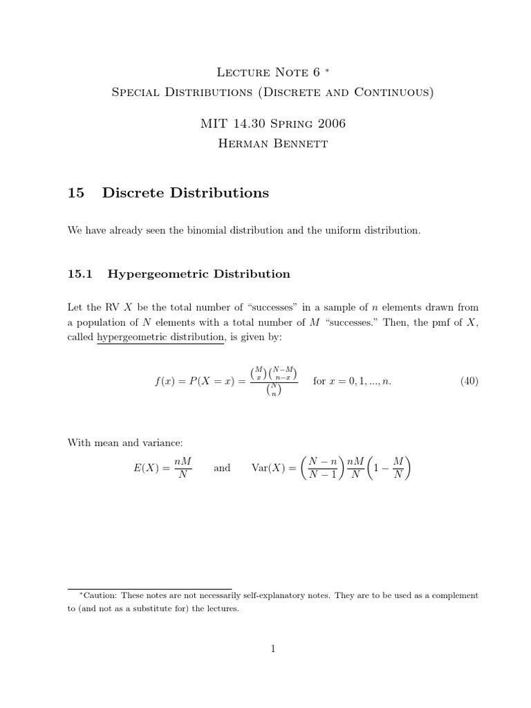 Special Distributions (Discrete and Continuous) MIT 14.30 Spring 2006 Herman Bennett