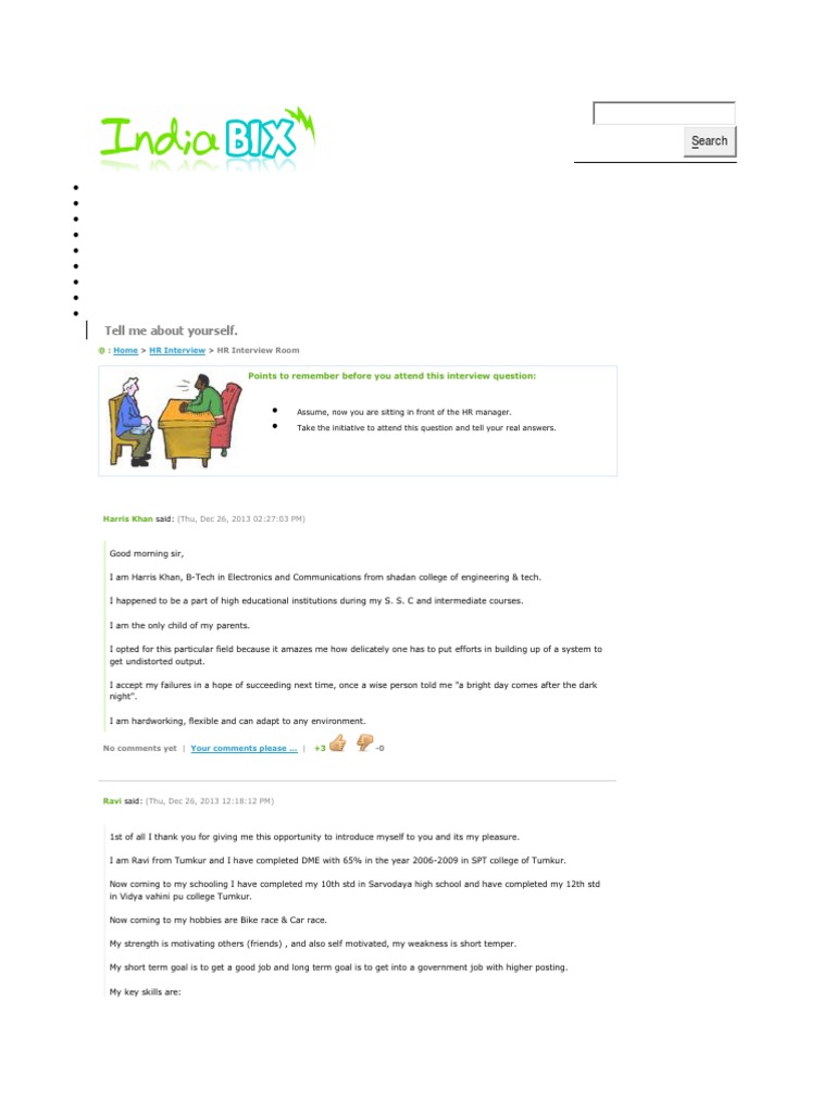 1st of all I thank you for giving me this opportunity to introduce myself to you and its my pleasure. I am Ravi from Tumkur and I have completed DME with 65% in the year 2006-2009 in SPT college of Tumkur. Now coming to my schooling I have completed my 10th std in Sarvodaya high school and have completed my 12th std in Vidya vahini pu college Tumkur. Now coming to my hobbies are Bike race & Car race. My strength is motivating others (friends) , and also self motivated, my weakness is short temper. My short term goal is to get a good job and long term goal is to get into a government job with higher posting. My key skills are: