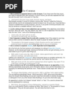 4. Put commas around the name of a person spoken to. I think, Bianca, you are absolutely right. Craig, how about a game of tennis? 5. Put commas around an expression that interrupts the flow of the sentence (for example: however, moreover, finally, therefore, of course, by the way,) He thought, however, that I should wait. It should, I think, take only an hour. But I think, I am sure, and similar expressions are not interrupters if they occur at the beginning of the sentence, so they don't require commas. I think it should only take an hour. However, therefore, on the other hand, etc., still require commas if they begin the sentence, and if they come between two independent clauses require a semicolon in front of them and a comma after. He was busy; however, he took time to help. 6. Put commas around nonessential material. The material may be interesting, but the main idea of the sentence would be clear without it. Gladys Nolan, who is heading the United Fund drive, broke her ankle. The clause who is heading the United Fund drive is not essential to the main idea of the sentence. Without it we still know exactly who the sentence is about and exactly what she did: Gladys Nolan broke her ankle. But in the following sentence: The woman who is heading the United Fund drive broke her ankle. The clause "who is heading the United Fund drive" is essential to the main idea of the sentence. Therefore, commas are not used around it. 7. Use commas to set off expressions such as he said or she asked from direct quotations. He said, "Our team will win the championship." "Our team," the coach asserted, "will win the championship." "Our team will win the championship," John stated.