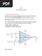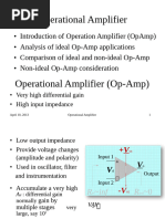 ELECTRONICS Electronic circuits may contain combinations of passive and active elements, and these may be linear or nonlinear devices. Many electronic elements are semiconductors, which are inherently nonlinear. While the curves are nonlinear, performance within a limited range may be assumed to be linear if the variations in incoming small signals are much less than the average (steady, DC, etc.) values. Amplifier operation is normally in the linear active region, but operation in other regions is possible for some applications. Operational Amplifiers An amplifier produces an output signal from the input signal. The input and output signals can be either voltage or current. The output can be either smaller or larger (usually larger) than the input in magnitude. In a linear amplifier, the input and output signals usually have the same waveform but may have a phase difference that could be as much as 180 degrees. For instance, an inverting amplifier is one for which vout = -Avvin. For a sinusoidal input, this is equivalent to a phase shift of 180 degrees. The ratio of the amplitude of the output signal to the amplitude of the input is known as the gain or amplification factor, A: AV if the input and output are voltages, and AI if they are currents. An operational amplifier (op amp) is a high-gain DC amplifier that multiplies the difference in input voltages. The equivalent circuit of an op amp is shown in Fig. 1. v =A v -v o v in + in -
