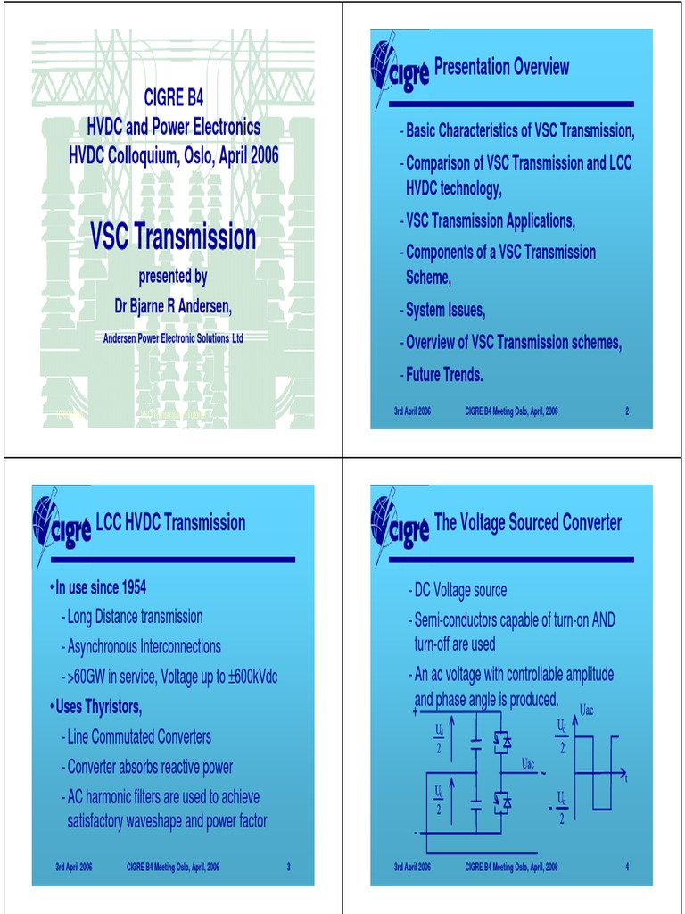 - Basic Characteristics of VSC Transmission, - Comparison of VSC Transmission and LCC HVDC technology, - VSC Transmission Applications, - Components of a VSC Transmission Scheme, - System Issues, - Overview of VSC Transmission schemes, - Future Trends.
