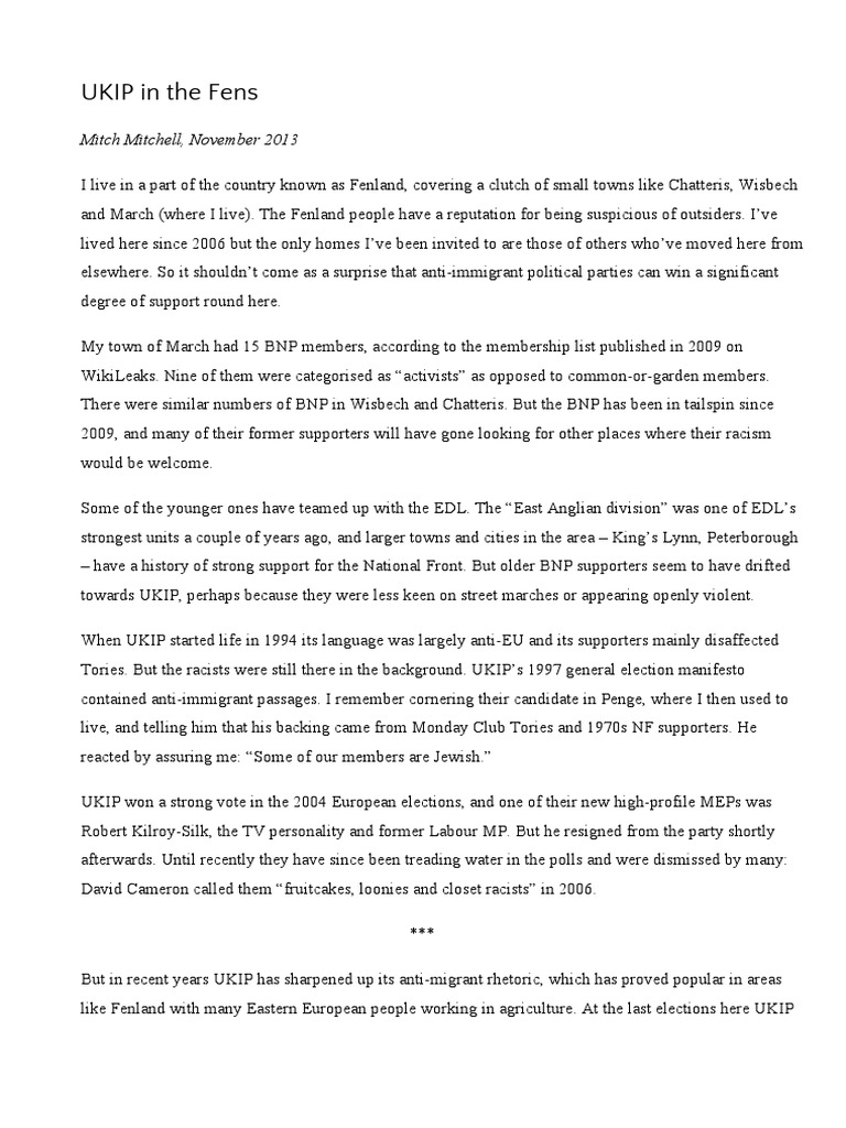 Mitch Mitchell looks at the impact of UKIP where he lives in Cambridgeshire, and how the party combines racist anti-immigrant appeal with a more populist edge.