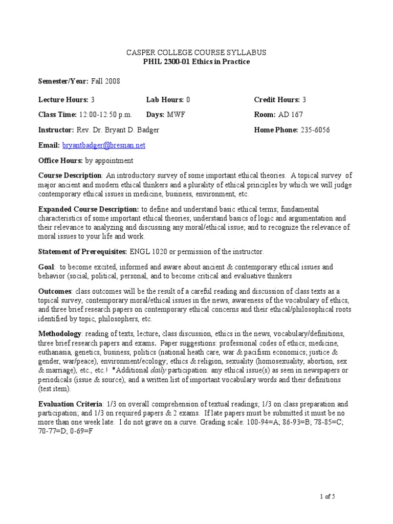 Course Description: An introductory survey of some important ethical theories. A topical survey of
