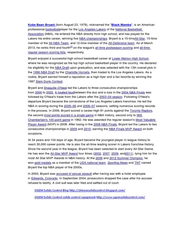 the Los Angeles Lakers of the National Basketball Association (NBA). He entered the NBA directly from high school, and has played for the Lakers his entire career, winning five NBA championships. Bryant is a 15-timeAll-Star, 15-time member of the All-NBA Team, and 12-time member of the All-Defensive team. As of March 2013, he ranks third and fourth
