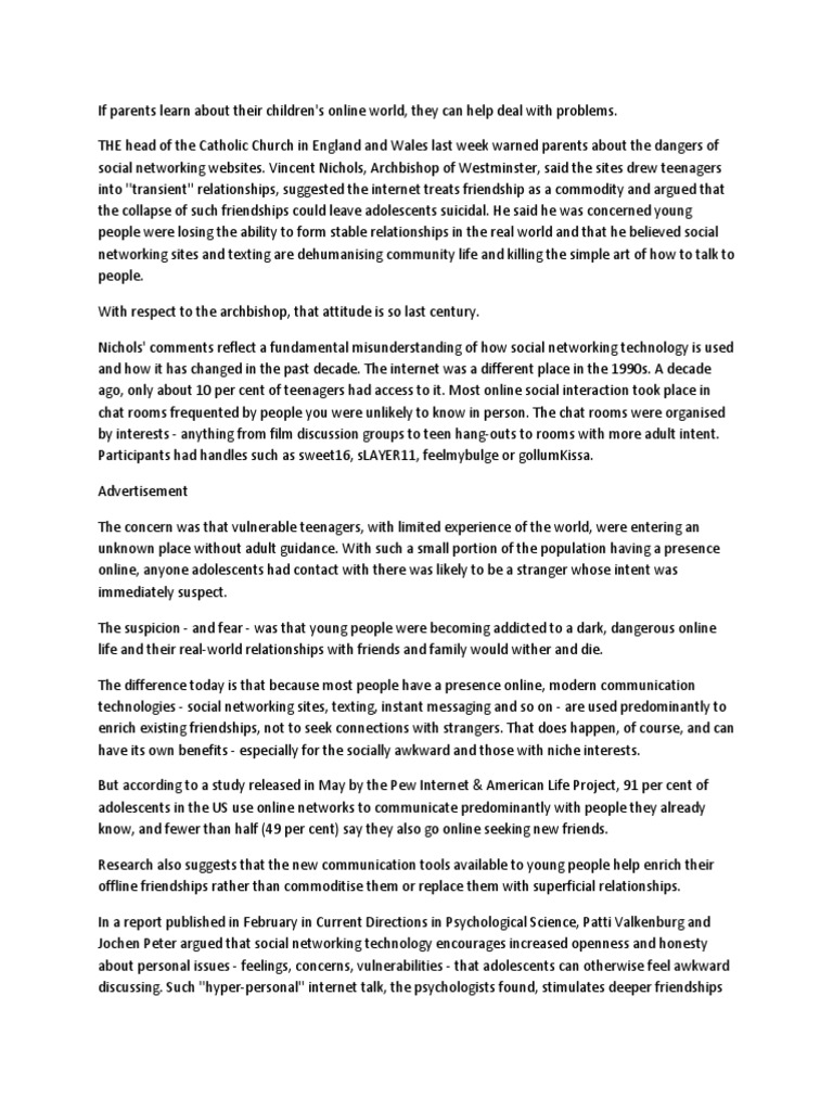 that help youngsters cope with the stress of teenage life and results in happier individuals. Boys, notoriously reluctant when it comes to discussing feelings, tend to benefit more than girls from this effect. In addition to these social benefits, a study conducted last year by the University of Minnesota suggested that using social networking sites improved technology and communication skills, boosted creativity and exposed students to new and diverse world views. Social networking activity taught students how to edit content, to think about design and encouraged the production and sharing of poetry, art, photographs and video content. These students also tended to do better in exams. So the archbishop's concerns about social networking technologies dehumanising community life and the transient nature of online relationships are unfounded. And yet there are other concerns the archbishop could have raised about the effects of technology. Online communication lacks the usual social cues - body language, tone of voice, facial expressions - that we use to gauge the emotional responses of those we speak to. This is partly why adolescents are more open online but the absence of social cues also enables cruelty and degrees of rudeness that are less prevalent in face-to-face communication - which has obvious ramifications for cyber-bullying and online harassment. Social networking also raises privacy issues, the potential for stalking when too much information is posted online, concerns about the shortening of attention spans, the encouragement of instant gratification and self-centredness, and lazy thinking practices. But these are also short-sighted complaints. Technology has moulded our behaviour for thousands of years. Writing is a technology that shapes and limits how we think. Should we call for limits to writing? Complaints about teenagers having short attention spans and being self-centred predate electricity, let alone the internet. The ancient Greeks had a bit to say on that subject. Much of our adolescence is spent learning how to find our way in the world, developing identity, managing how we appear to others, wrestling with issues of self-worth and popularity. Social networking sites are as useful for learning how to relate with the world as the playground, shopping centre or wherever else teens gather. But when behaviour is less than ideal, deal with that, don't blame the delivery method. Knee-jerk negative reactions to technology are not useful. We need to learn how to navigate new waters and teach that to our children. Or let them teach us - they seem to be doing just fine already. Gordon Farrer is technology editor.