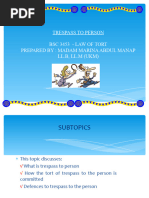 . Introduction: Definition: (i) Tort means a wrong and this is derived from the Latin word Tortus (ii) Aim and objective of law of Tort The aims and objectives of the law of tort is to give compensation to those who have been wronged by others, thus the law of tort is different from the law of contract which aim is to deal with enforcement agreements. (iii) Liability in Tort Strict Liability and Intentional tort (fault liability) Historically, the liability of a tortfeasor (someone who commits tort) used to be based on the concept of strict liability. The courts were not prepared to establish liability in tort on whether the tortfeasor acted voluntarily or not. The modern approach is that liability in tort is based on FAULT in which the INTENTION of the tortfeasor would determine his guilt. This led to the concept of Intentional Torts even though there are a few torts now based on the concept of strict liability. 2. INTENTIONAL TORTS Trespass to the Person Battery What is battery? 1. Battery is defined as any act of the defendant which directly and their intentionally or negligently causes some physical contact with the body of the plaintiff without his consent. 2. The elements of the tort of battery can be broken down as follows: Elements 1. There must be a direct act of the defendant (Scott v Shepherd) In this case a direct act was defined to include the continuation of the act of the defendant by an independent person. 2. The defendant should have acted voluntarily, deliberately, intentionally or carelessly. If the defendants act was accidental then the plaintiff action will not succeed.