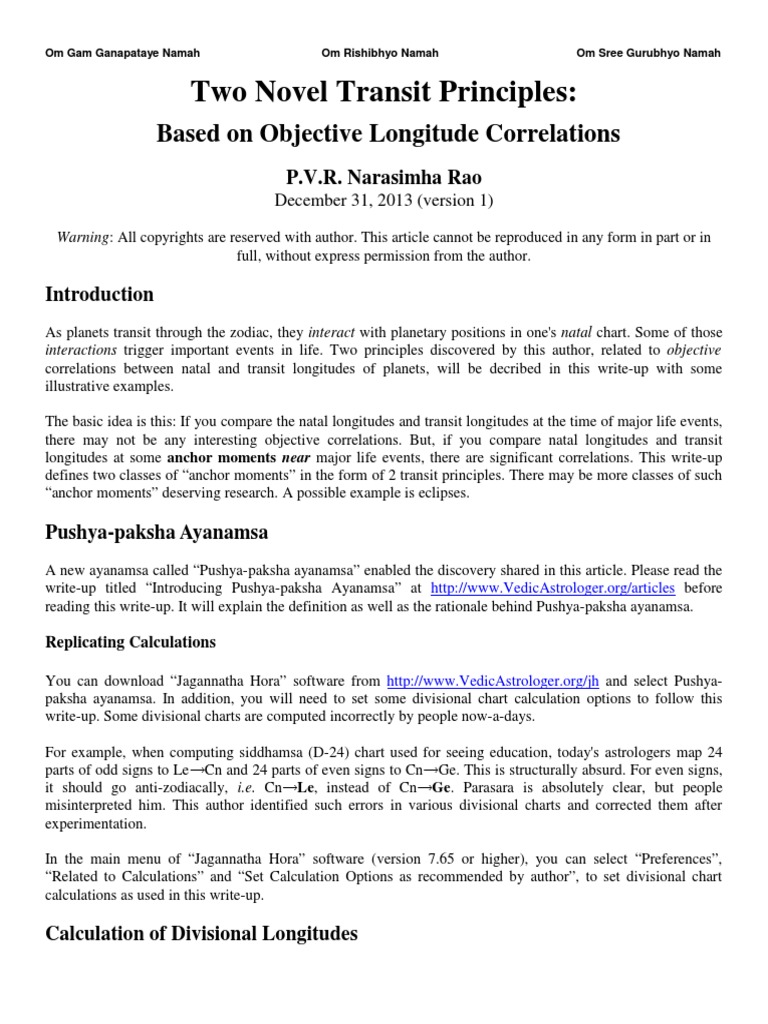 The correlations I found in this research are too good to merely be random coincidences. I am convinced that there is something really worthwhile here. In fact, principles such as this, which show nice quantitative correlations, may prove useful someday to convince critics of astrology that astrology is not humbug. Compared to my previous attempts at unearthing such longitude correlations, this attempt contains a far more structured and logical methodology! Divisional Longitudes This research article establishes that divisional longitudes are a valid concept and that there are some valid transit principles based on them. Researchers will do well to consider longitudes of planets in divisional charts and not ignore them.