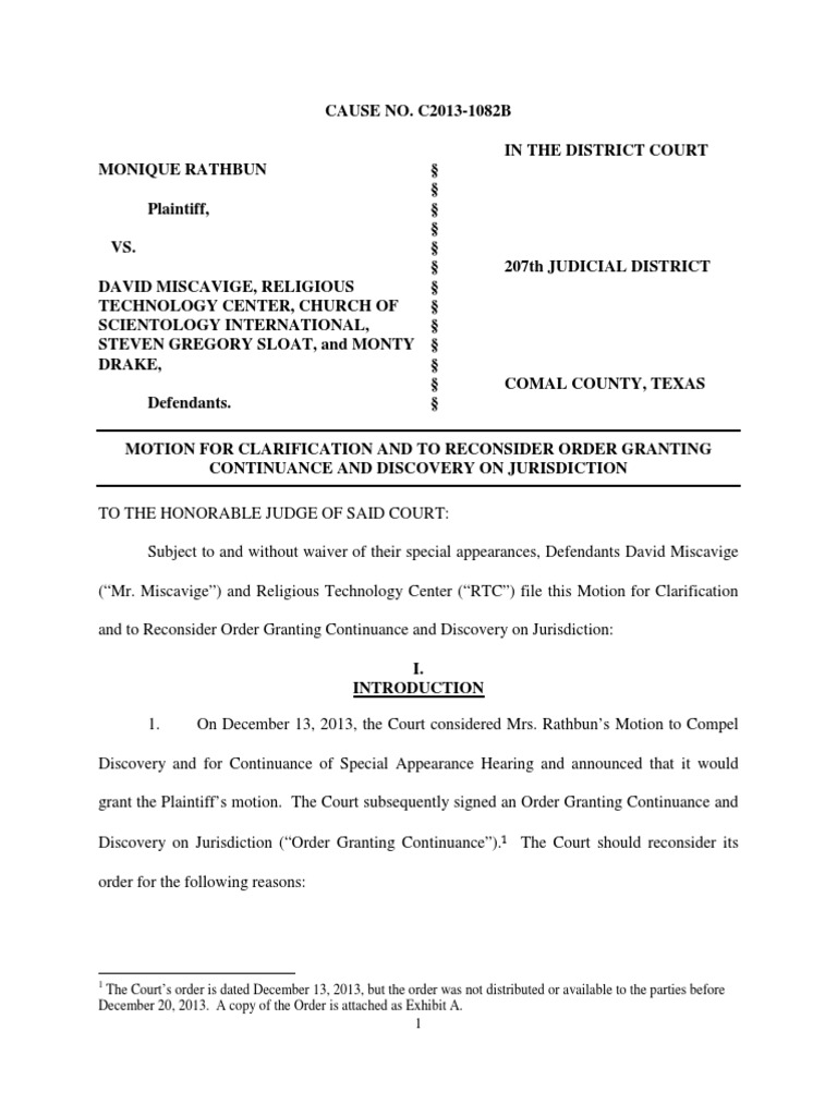CAUSE NO. C2013-1082BIN THE DISTRICT COURT207th JUDICIAL DISTRICTCOMAL COUNTY, TEXASMONIQUE RATHBUNPlaintiff,VS.DAVID MISCAVIGE, RELIGIOUSTECHNOLOGY CENTER, CHURCH OFSCIENTOLOGY INTERNATIONAL,STEVEN GREGORY SLOAT, and MONTYDRAKE,Defendants.§§§§§§§§§§§§§MOTION FOR CLARIFICATION AND TO RECONSIDER ORDER GRANTINGCONTINUANCE AND DISCOVERY ON JURISDICTION