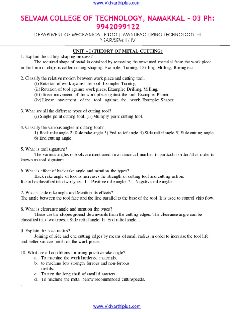 DEPARTMENT OF MECHANICAL ENGG.| MANUFACTURING TECHNOLOGY II YEAR/SEM: II/ IV UNIT I (THEORY OF METAL CUTTING) 1. Explain the cutting shaping process? The required shape of metal is obtained by removing the unwanted material from the work piece in the form of chips is called cutting shaping. Example: Turning, Drilling, Milling, Boring etc. 2. Classify the relative motion between work piece and cutting tool. (i) Rotation of work against the tool. Example: Turning, (ii) Rotation of tool against work piece. Example: Drilling, Milling, (iii) linear movement of the work piece against the tool. Example: Planer, (iv) Linear movement of the tool against the work. Example: Shaper. 3. What are all the different types of cutting tool? (i) Single point cutting tool, (ii) Multiply point cutting tool. 4. Classify the various angles in cutting tool? 1) Back rake angle 2) Side rake angle 3) End relief angle 4) Side relief angle 5) Side cutting angle 6) End cutting angle. 5. What is tool signature? The various angles of tools are mentioned in a numerical number in particular order. That order is known as tool signature. 6. What is effect of back rake angle and mention the types? Back rake angle of tool is increases the strength of cutting tool and cutting action. It can be classified into two types. 1. Positive rake angle. 2. Negative rake angle. 7. What is side rake angle and Mention its effects? The angle between the tool face and the line parallel to the base of the tool. It is used to control chip flow. 8. What is clearance angle and mention the types? These are the slopes ground downwards from the cutting edges. The clearance angle can be classified into two types. i Side relief angle. Ii. End relief angle. . 9. Explain the nose radius? Joining of side and end cutting edges by means of small radius in order to increase the tool life and better surface finish on the work piece. 10. What are all conditions for using positive rake angle? a. To machine the work hardened materials. b. to machine low strength ferrous and non-ferrous metals. c. To turn the long shaft of small diameters. d. To machine the metal below recommended cuttinspeeds. .