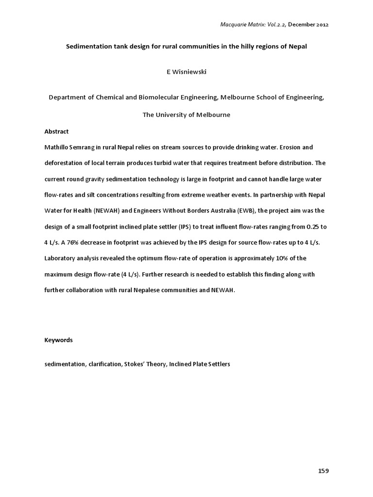 Drinking Water in Thumi VDC Nepal Nepal ranks among the top nations in terms of fresh water potential Water Resources Management Committee, 2010). The secure provision and distribution of drinking water is crucial in boosting socio-economical development and increasing standards of living, but little has been done thus far at a government level to ensure this outcome. In rural areas, the majority of the inhabitants do not have access to safe drinking water. One such rural village is Mathillo Semrang in the Thumi Village Development Community (VDC) in the Western Region of Nepal. Drinking water in Mathillo Semrang is sourced from hill and mountain springs that are subject to high sediment loads, particularly during monsoon and landslide events. Large concentrations of fine sediment in suspension results in high turbidity water sources. Mountainous terrain deforestation and land degradation are key contributors to high sediment inflows (Julien & Shah, 2005). Nepal Water for Health (NEWAH) is the national Nepalese non-government organisation established in 1992 to address the water and sanitation (WASH) needs of the rural communities of Nepal (Nepal Water for Health, 2011). Many NEWAH WASH programs involve the upgrade or installation of water supply systems from source to tap. In the hilly regions of the Western region of Nepal, where sources are turbid, NEWAH and local workers install sedimentation facilities prior to the distribution of water to villages. Traditionally these sedimentation facilities have consisted of round sedimentation tanks employing gravity sedimentation. However, it has been identified by NEWAH that in many cases there is insufficient space for the existing technology.