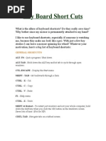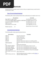 between open programs Closes the program Opens the Windows Shutdown&Restart dialog box Opens the Properties page of a selected item Cycle between open programs in the order that they were opened In the active window, this brings up the dialog box for Move, Size, Minimize, Alt + Spacebar Maximize, or Close Shift + Insert CD or DVD lnserts a CD/DVD without triggering Autoplay or Autorun Shift + Delete Permanently deletes an item (rather than sending it to the Recycle Bin) Ctrl+Shift+Esc Opens the Windows Task Manager Ctrl + drag an icon Copies that item Ctrl + Shift + drag an icon Creates a shortcut for the item Right-click + drag a fiIe Brings up a menu to copy, move, or create a shortcut PrtScn Take a screen shot of the entire screen so you can paste into a graphics program Takes a screen shot of only the active Window so you can paste into a graphics Alt + PrtScn program F1 Opens the Windows XP Help F2 Rename selected item F3 Opens Windows search for files and folders F5 (or Crl + R) Refresh Internet Explorer page, or refresh any other window Cycle through the different types of elements that can be selection on a screen or F6 window Selects the menu bar in the active program (usually File) so that you can use the F10 arrow keys to navigate through the menus and the Enter key to select Shift + F10 For a selected item, this does the same thing as a right-click with the mouse Tab Move through the different elements on a page or the fields in a form Shift + Tab Move backward through the different elements on a page or the fields in a form Ctrl + A Select All Ctrl + C Copy CtrI + X Cut CtrI + V Paste Ctrl + Z Undo Ctrl + Y Redo Ctrl + P Print CtrI + O Open CtrI + Esc Opens the Star menu Ctrl + Backspace Deletes the entire word to the left Ctrl + Delete Deletes the entire word to the right Ctrl + Right arrow Moves the cursor to the beginning of the next word Ctrl + Left arrow Moves the cursor to the beginning of the prevous word Ctrl + Down arrow Moves The cursor to the beginning of the next paragraph Ctrl + Up arrow Moves the cursor to the beginning of the previous paragraph