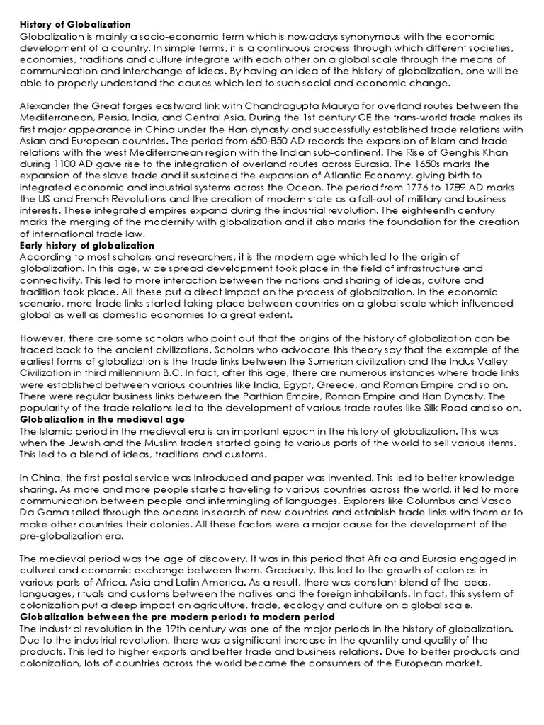 In simple terms, it is a continuous process through which different societies, economies, traditions and culture integrate with each other on a global scale through the means of communication and interchange of ideas. By having an idea of the history of globalization, one will be able to properly understand the causes which led to such social and economic change. Alexander the Great forges eastward link with Chandragupta Maurya for overland routes between the Mediterranean, Persia, India, and Central Asia. During the 1st century CE the trans-world trade makes its first major appearance in China under the Han dynasty and successfully established trade relations with Asian and European countries. The period from 650-850 AD records the expansion of Islam and trade relations with the west Mediterranean region with the Indian sub-continent. The Rise of Genghis Khan during 1100 AD gave rise to the integration of overland routes across Eurasia. The 1650s marks the expansion of the slave trade and it sustained the expansion of Atlantic Economy, giving birth to integrated economic and industrial systems across the Ocean. The period from 1776 to 1789 AD marks the US and French Revolutions and the creation of modern state as a fall-out of military and business interests. These integrated empires expand during the industrial revolution. The eighteenth century marks the merging of the modernity with globalization and it also marks the foundation for the creation of international trade law. Early history of globalization According to most scholars and researchers, it is the modern age which led to the origin of globalization. In this age, wide spread development took place in the field of infrastructure and connectivity. This led to more interaction between the nations and sharing of ideas, culture and tradition took place. All these put a direct impact on the process of globalization. In the economic scenario, more trade links started taking place between countries on a global scale which influenced global as well as domestic economies to a great extent. However, there are some scholars who point out that the origins of the history of globalization can be traced back to the ancient civilizations. Scholars who advocate this theory say that the example of the earliest forms of globalization is the trade links between the Sumerian civilization and the Indus Valley Civilization in third millennium B.C. In fact, after this age, there are numerous instances where trade links were established between various countries like India, Egypt, Greece, and Roman Empire and so on. There were regular business links between the Parthian Empire, Roman Empire and Han Dynasty. The popularity of the trade relations led to the development of various trade routes like Silk Road and so on. Globalization in the medieval age The Islamic period in the medieval era is an important epoch in the history of globalization. This was when the Jewish and the Muslim traders started going to various parts of the world to sell various items. This led to a blend of ideas, traditions and customs. In China, the first postal service was introduced and paper was invented. This led to better knowledge sharing. As more and more people started traveling to various countries across the world, it led to more communication between people and intermingling of languages. Explorers like Columbus and Vasco Da Gama sailed through the oceans in search of new countries and establish trade links with them or to make other countries their colonies. All these factors were a major cause for the development of the pre-globalization era. The medieval period was the age of discovery. It was in this period that Africa and Eurasia engaged in cultural and economic exchange between them. Gradually, this led to the growth of colonies in various parts of Africa, Asia and Latin America. As a result, there was constant blend of the ideas, languages, rituals and customs between the natives and the foreign inhabitants. In fact, this system of colonization put a deep impact on agriculture, trade, ecology and culture on a global scale. Globalization between the pre modern periods to modern period The industrial revolution in the 19th century was one of the major periods in the history of globalization. Due to the industrial revolution, there was a significant increase in the quantity and quality of the products. This led to higher exports and better trade and business relations. Due to better products and colonization, lots of countries across the world became the consumers of the European market.