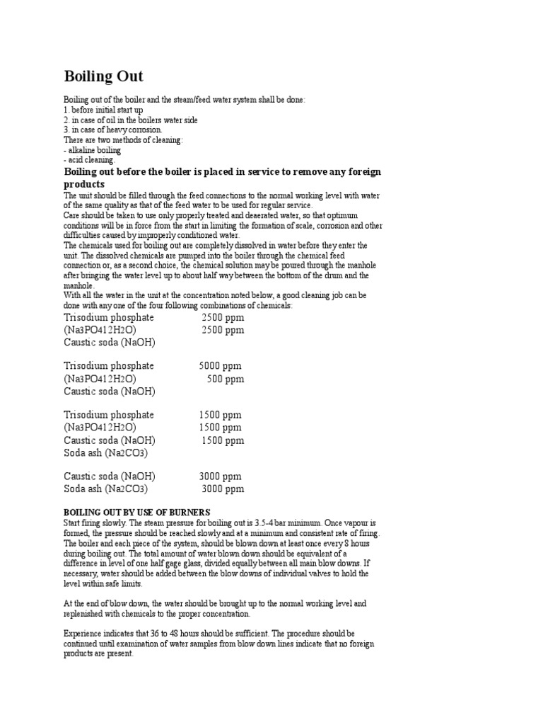 Boiling out of the boiler and the steam/feed water system shall be done: 1. before initial start up 2. in case of oil in the boilers water side 3. in case of heavy corrosion. There are two methods of cleaning: - al aline boiling - acid cleaning.