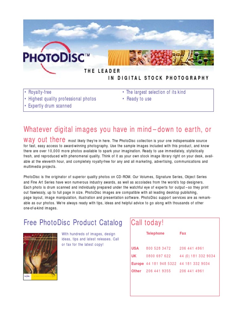 PhotoDisc, Inc. 2013 Fourth Avenue Seattle, Washington 98121 Call toll free Monday to Friday, 6am6pm PST: 1 800 528 3472