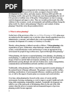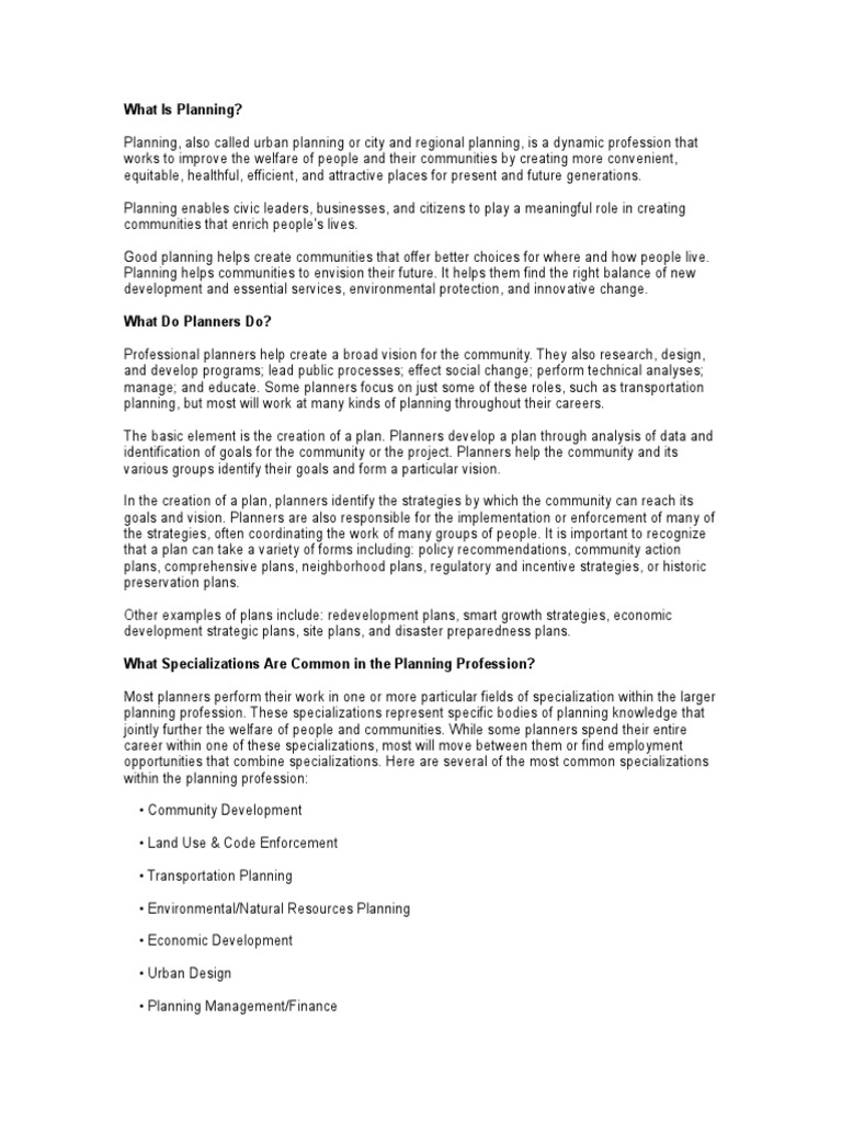 Planning, also called urban planning or city and regional planning, is a dynamic profession that works to improve the welfare of people and their communities by creating more convenient, equitable, healthful, efficient, and attractive places for present and future generations. Planning enables civic leaders, businesses, and citizens to play a meaningful role in creating communities that enrich people's lives. Good planning helps create communities that offer better choices for where and how people live. Planning helps communities to envision their future. It helps them find the right balance of new development and essential services, environmental protection, and innovative change. What Do Planners Do? Professional planners help create a broad vision for the community. hey also research, design, and develop programs! lead public processes! effect social change! perform technical analyses! manage! and educate. "ome planners focus on #ust some of these roles, such as transportation planning, but most will work at many kinds of planning throughout their careers. he basic element is the creation of a plan. Planners develop a plan through analysis of data and identification of goals for the community or the pro#ect. Planners help the community and its various groups identify their goals and form a particular vision. In the creation of a plan, planners identify the strategies by which the community can reach its goals and vision. Planners are also responsible for the implementation or enforcement of many of the strategies, often coordinating the work of many groups of people. It is important to recognize that a plan can take a variety of forms including$ policy recommendations, community action plans, comprehensive plans, neighborhood plans, regulatory and incentive strategies, or historic preservation plans. %ther e&les of plans include$ redevelopment plans, smart growth strategies, economic development strategic plans, site plans, and disaster preparedness plans. What Specializations Are Common in the Planning Profession? 'ost planners perform their work in one or more particular fields of specialization within the larger planning profession. hese specializations represent specific bodies of planning knowledge that #ointly further the welfare of people and communities. (hile some planners spend their entire career within one of these specializations, most will move between them or find employment opportunities that combine specializations. )ere are several of the most common specializations within the planning profession$ * +ommunity ,evelopment * -and .se / +ode 0nforcement * ransportation Planning * 0nvironmental12atural 3esources Planning * 0conomic ,evelopment * .rban ,esign * Planning 'anagement14inance