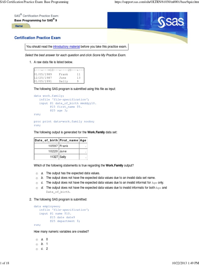 Which of the following statements is true regarding the [Link] output? a. The output has the expected data values. b. The output does not have the expected data values due to an invalid data set name. c. The output does not have the expected data values due to an invalid informat for Age only. d. The output does not have the expected data values due to invalid informats for both Age and Date_of_birth. 2. The following SAS program is submitted: data employees; infile 'file-specification'; input @1 name $10. @15 date date9 @25 department $; run; How many numeric variables are created? a. 0 b. 1 c. 2