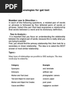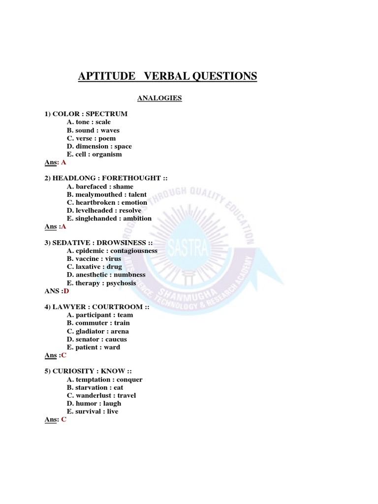 ANALOGIES 1) COLOR : SPECTRUM A. tone : scale B. sound : waves C. verse : poem D. dimension : space E. cell : organism Ans: A 2) HEADLONG : FORETHOUGHT :: A. barefaced : shame B. mealymouthed : talent C. heartbroken : emotion D. levelheaded : resolve E. singlehanded : ambition Ans :A 3) SEDATIVE : DROWSINESS :: A. epidemic : contagiousness B. vaccine : virus C. laxative : drug D. anesthetic : numbness E. therapy : psychosis ANS :D 4) LAWYER : COURTROOM :: A. participant : team B. commuter : train C. gladiator : arena D. senator : caucus E. patient : ward Ans :C 5) CURIOSITY : KNOW :: A. temptation : conquer B. starvation : eat C. wanderlust : travel D. humor : laugh E. survival : live Ans: C