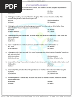 10. L is east of M and west of N. J is south east of N. M is southeast of F. Which is farthest west? Ans: F is the farthest west. 11. Fs grandfather is A. A has two sons only E and C. C is unmarried. How is F related to E? Ans: Since C is unmarried E has to be the father of As grandson. 12. Boys maternal uncle will be brother of boys mother. Maternal uncle of mothers brother and maternal uncle of lady are brother means lady is sister of mothers brother. Ans: The boy is womans son. 13. Pointing at a photo, Dinesh said, His father is the only son of my mother. The photo belongs to Ans: Father. 14. A is the mother of B and C. If D is the husband of C, what is A to D? Ans: Mother in law. 15. Introducing a lady, a man said, Her mother is the only daughter of my mother-in-law. What is the man to the lady? Ans: Father. 16. A man said to a lady, The son of your only brother is the brother of my wife. What is the lady to the man? Ans: Relationship is sister of father in law. 17. Arun said, This girl is the wife of the grandson of my mother. Who is Arun to the girl? Ans: Arun is the father in law of the girl. 18. If Bs mother was As mothers daughter. How was a related to B? Ans: A is Aunt / Uncle of B. 19. Anil introduces Rohit as the son of the only brother of his fathers wife. How is Rohit related to Anil? Ans: Rohit is Anils cousin. 20. Pointing to a man on the stage, Rita said, He is the brother of the daughter of the wife of my husband. How is the man on the stage related to Rita? Ans: The man is Ritas son. 21. If in a certain language PRACTICE is coded a PICCTRAE, how is FLAMES coded in that code? Ans: FMELAS