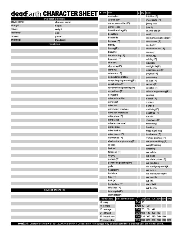 deadEarth Character Sheet • ©1994-2000 Anarchy inK Corporation • This page may be duplicated for personal use, but not for profit.