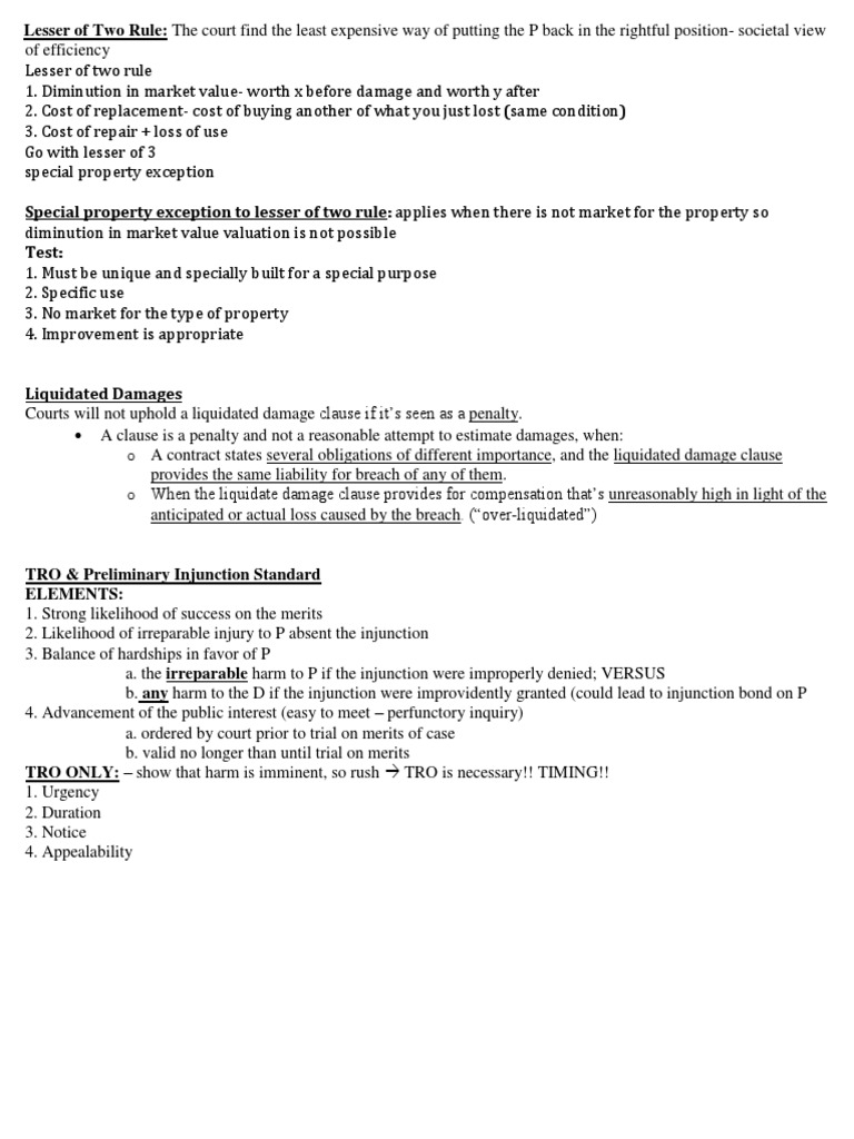 position- societal view of efficiency Lesser of two rule 1. Diminution in market value- worth x before damage and worth y after 2. Cost of replacement- cost of buying another of what you just lost (same condition) 3. Cost of repair + loss of use Go with lesser of 3 special property exception Special property exception to lesser of two rule: applies when there is not market for the property so diminution in market value valuation is not possible Test: 1. Must be unique and specially built for a special purpose 2. Specific use 3. No market for the type of property 4. Improvement is appropriate Liquidated Damages Courts will not uphold a liquidated damage clause if its seen as a penalty. A clause is a penalty and not a reasonable attempt to estimate damages, when: o A contract states several obligations of different importance, and the liquidated damage clause provides the same liability for breach of any of them. o When the liquidate damage clause provides for compensation thats unreasonably high in light of the anticipated or actual loss caused by the breach. (over-liquidated)