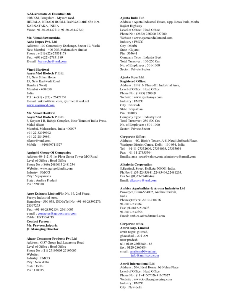 KARNATAKA, INDIA Voice : 91-80-28437719, 91-80-28437720 Mr. Vimal Sawansukha Aaha Impex Pvt. Ltd Address : 130 Commodity Exchange, Sector 19, Vashi New Mumbai - 400 705, Maharashtra (India) Phone : +(91)-(22)-27831178 Fax : +(91)-(22)-27831189 E-mail : barmecha@vsnl.com Vinod Haritwal AayurMed Biotech P. Ltd. 31, New Silver Home 15, New Kantwadi Road Bandra ( West) Mumbai - 400 050 India Tel : + (91) - (22) - 26421551 E-mail : nikmo@vsnl.com, ayurmed@vsnl.net www.aayurmed.com Mr. Vinod Haritwal AayurMed Biotech P. Ltd. 3, Satyam I-B, Raheja Complex, Near Times of India Press, Malad (East) Mumbai, Maharashtra, India-400097 +91-22-32919302 +91-22-28429861 nikmo@vsnl.com Mobile +919869711527 Agrigold Group Of Companies Address 40- 1-21/3 1st Floor Surya Tower MG Road Level of Office : Head Office Phone No : (866) 2486013 2481754 Website : www.agrigoldindia.com Industry : FMCG City : Vijayawada State : Andhra Pradesh Pin : 520010 Agro Extracts LimitedPlot No. 16, 2nd Phase, Peenya Industrial Area, Bangalore - 560 058. INDIATel No: +91-80-28397276, 28397275 Fax : +91-80-28392134, 23610005 e-mail : contactus@agroextracts.com Cable : EXTRACTS Contact Person : Mr. Praveen Jaipuria Jt. Managing Director Ahaar Consumer Products Pvt Ltd Address : G 37 Group Indl,Lawrence Road Level of Office : Head Office Phone No : (11) 27195003 27195005 Website : Industry : FMCG City : New delhi State : Delhi Pin : 110035