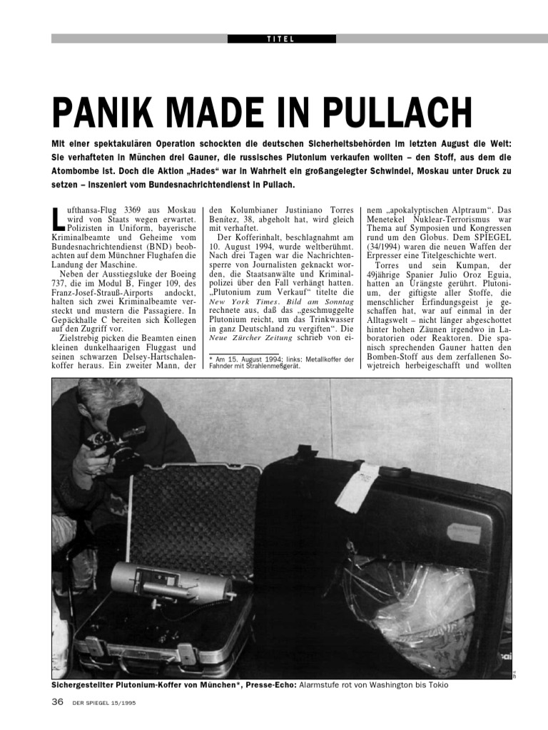 Polizisten in Uniform, bayerischeKriminalbeamte und Geheime vomBundesnachrichtendienst (BND) beob-achten auf dem Münchner Flughafen dieLandung der Maschine.Neben der Ausstiegsluke der Boeing737, die im Modul B, Finger 109, desFranz-Josef-Strauß-Airports andockt,halten sich zwei Kriminalbeamte ver-steckt und mustern die Passagiere. InGepäckhalle C bereiten sich Kollegenauf den Zugriff vor.Zielstrebig picken die Beamten einenkleinen dunkelhaarigen Fluggast undseinen schwarzen Delsey-Hartschalen-koffer heraus. Ein zweiter Mann, derden Kolumbianer Justiniano TorresBenı´tez, 38, abgeholt hat, wird gleichmit verhaftet.Der Kofferinhalt, beschlagnahmt am10. August 1994, wurde weltberühmt.Nach drei Tagen war die Nachrichten-sperre von Journalisten geknackt wor-den, die Staatsanwälte und Kriminal-polizei über den Fall verhängt hatten.„Plutonium zum Verkauf“ titelte die