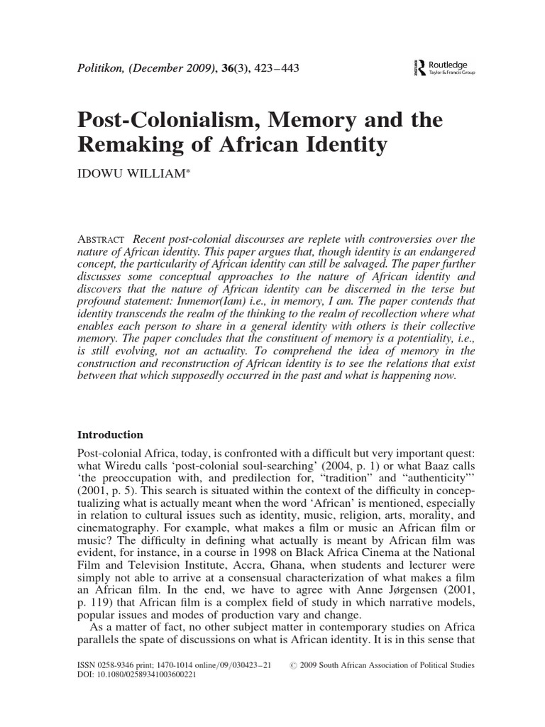 Though endangered in signicant respects, it does not follow that a thesis cannot be maintained and sustained concerning the nature of African identity. Postcolonial engagement, today, on the nature of African identity, may not entirely be about changing the past, as suggested by William Burton (1982, p. 14), but about changing negative images around, concerning, and about, Africa. Note