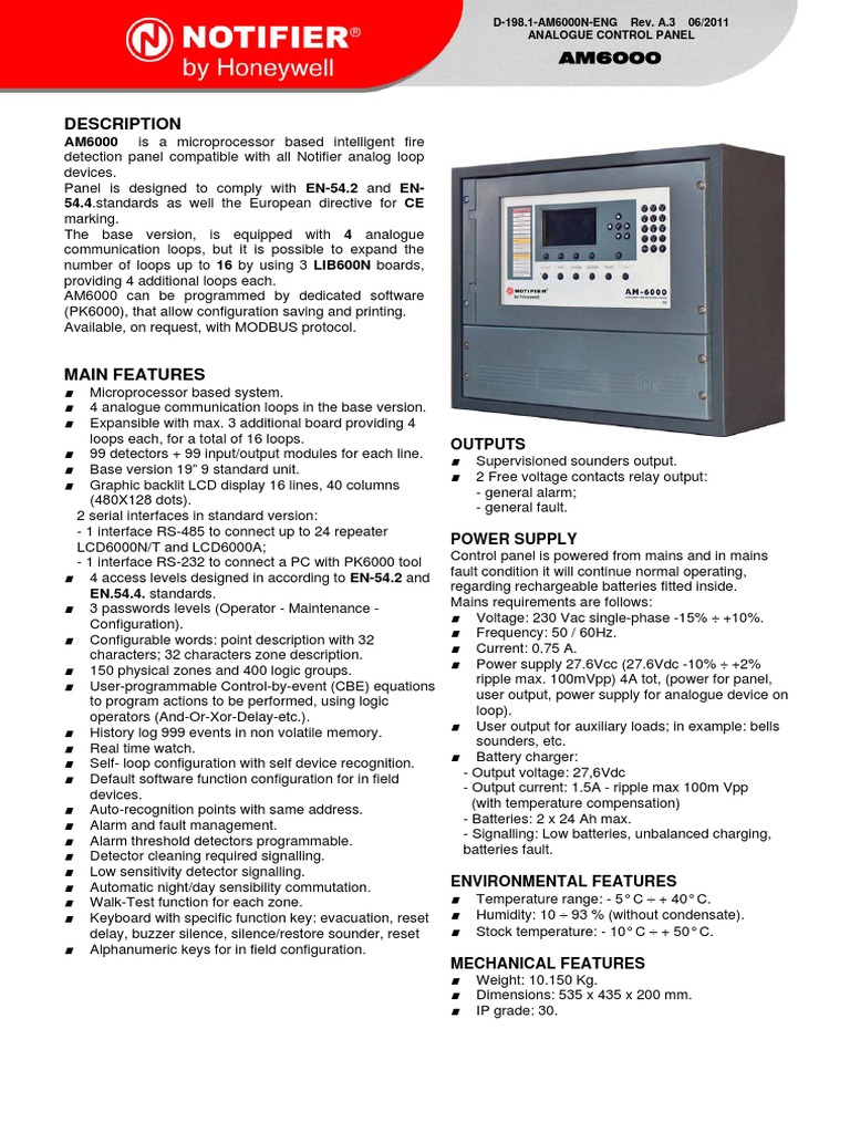 Microprocessor based system. 4 analogue communication loops in the base version. Expansible with max. 3 additional board providing 4 loops each, for a total of 16 loops. 99 detectors + 99 input/output modules for each line. Base version 19 9 standard unit. Graphic backlit LCD display 16 lines, 40 columns (480X128 dots). 2 serial interfaces in standard version: - 1 interface RS-485 to connect up to 24 repeater LCD6000N/T and LCD6000A; - 1 interface RS-232 to connect a PC with PK6000 tool 4 access levels designed in according to EN-54.2 and EN.54.4. standards. 3 passwords levels (Operator - Maintenance Configuration). Configurable words: point description with 32 characters; 32 characters zone description. 150 physical zones and 400 logic groups. User-programmable Control-by-event (CBE) equations to program actions to be performed, using logic operators (And-Or-Xor-Delay-etc.). History log 999 events in non volatile memory. Real time watch. Self- loop configuration with self device recognition. Default software function configuration for in field devices. Auto-recognition points with same address. Alarm and fault management. Alarm threshold detectors programmable. Detector cleaning required signalling. Low sensitivity detector signalling. Automatic night/day sensibility commutation. Walk-Test function for each zone. Keyboard with specific function key: evacuation, reset delay, buzzer silence, silence/restore sounder, reset Alphanumeric keys for in field configuration.