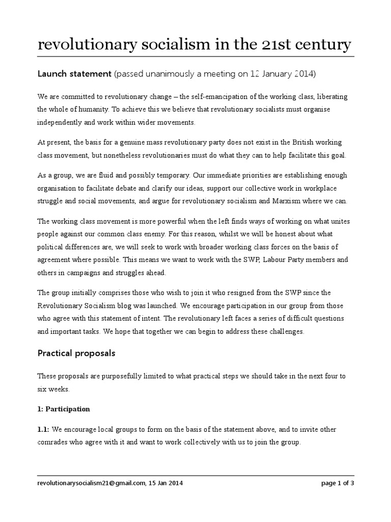 A group of comrades previously involved in the SWP opposition over recent months met in London on Sunday 12 January. We agreed to start the process of creating a new group for revolutionary socialists in Britain. For now the group will use the name of this blog: Revolutionary Socialism in the 21st Century (rs21). The meeting unanimously passed this launch statement.