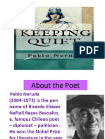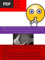 Neftali Ricardo Reyes Basoalto, better known as Pablo Neruda is an ace Chilean poet and writes in Spanish as well as English.Simple,yet vivid descriptions of his thoughts makes him a beautiful poet,who is understood by all. In the poem'Keeping Quiet' , Pablo Neruda emphasises on self -realisation and makes an appeal for peace among mankind. 'Now we will count to twelve and we will all keep still'.. The poem open beautifully , with these lines creating an atmosphere of peace and silence, mentally preparing the reader to calmly listen to what Neruda wants to convey. The poem advances further , leaving a soothing effect, making an appeal to the reader to go into a pleasant oblivion and idleness. 'Let's not speak in any language...let's stop for one second..' Neruda is not particularly aiming at few people of a particular culture or nation,but appealing to whole of the mankind. He wishes for a complete inactivity, no moment,no actions,no words and not even the language of thoughts. He describes this inactivity and idleness as an 'exotic moment'..pulling us away from the rat race and tensions of this fast moving life. 'Fishermen in the cold sea,would not harm whales' ' Those who prepare green wars...would put on clean clothes and walk about with their brothers'.. How calm and soothing this world would turn into if everyone could realise what their actions lead to , by going in a 'sudden strangeness' of silence.