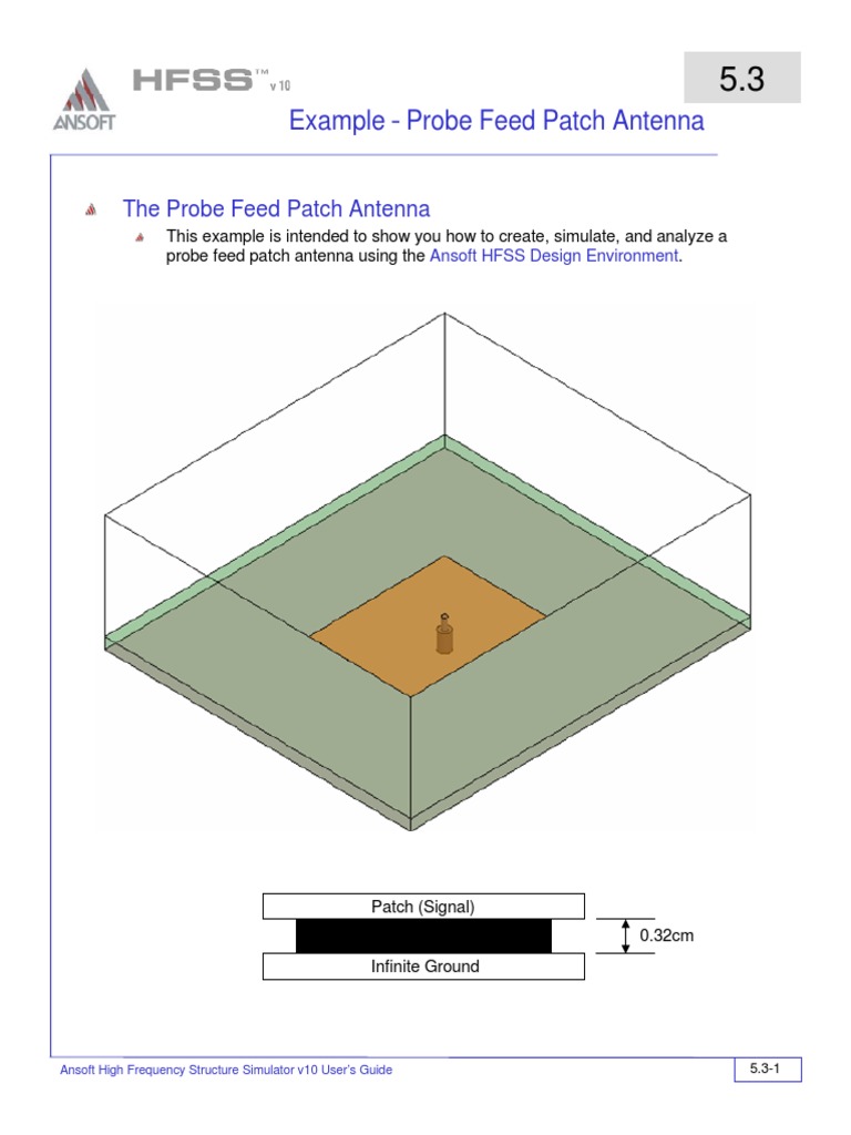 This example is intended to show you how to create, simulate, and analyze a probe feed patch antenna using the Ansoft HFSS Design Environment.