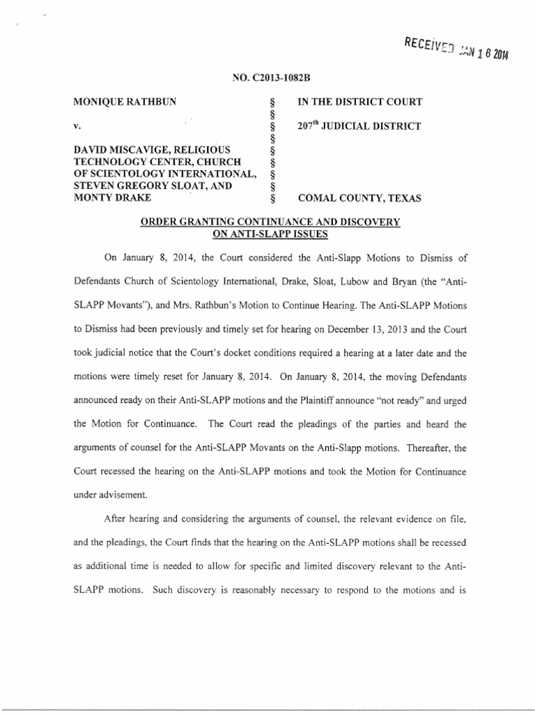 Monique Rathbun V Scientology: Order Granting Continuance and Discovery Request