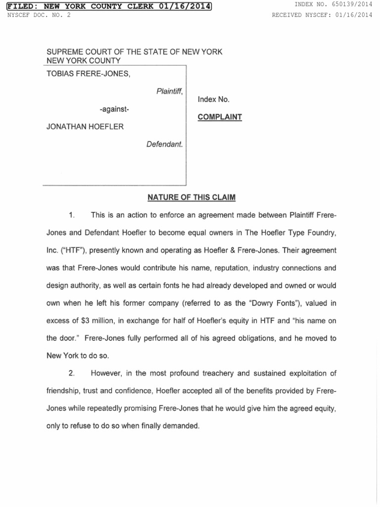TOBIAS FRERE-JONES, Plaintiff, Index No. -against- COMPLAINT JONATHAN HOEFLER Defendant. NATURE OF THIS CLAIM 1. This is an action to enforce an agreement made between Plaintiff Frere- Jones and Defendant Hoefler to become equal owners in The Hoefler Type Foundry, Inc. ("HTF"), presently known and operating as Hoefler & Frere-Jones. Their agreement was that Frere-Jones would contribute his name, reputation, industry connections and design authority, as well as certain fonts he had already developed and owned or would own when he left his former company (referred to as the "Dowry Fonts"), valued in excess of $3 million, in exchange for half of Hoefler's equity in HTF and "his name on the door." Frere-Jones fully performed all of his agreed obligations, and he moved to New York to do so. 2. However, in the most profound treachery and sustained exploitation of friendship, trust and confidence, Hoefler accepted all of the benefits provided by Frere- Jones while repeatedly promising Frere-Jones that he would give him the agreed equity, only to refuse to do so when finally demanded. FILED: NEW YORK COUNTY CLERK 01/16/2014 INDEX NO. 650139/2014 NYSCEF DOC. NO. 2 RECEIVED NYSCEF: 01/16/2014 JURISDICTION AND VENUE 3. This Court has personal jurisdiction over the defendants pursuant to CPLR 301 because both parties are residents of New York City and acts complained of occurred here, and venue is proper pursuant to CPLR Article 5. THE PARTIES 4. Plaintiff Tobias Frere-Jones is one of the world's leading and most recognized type designers, having designed over 800 fonts, in over 145 languages, that are widely used in newspapers, magazines, advertising, packaging, websites, corporate identities, political campaigns and websites around the world. He joined the faculty of the Yale School of Art in 1996 and frequently lectures on typeface design and typography at other academic institutions and graphic design organizations throughout the world. His work has been profiled in many trade and general purpose publications, and is included in the permanent collection of the Victoria & Albert Museum, London and the Museum of Modern Art, New York. In 2006, Frere-Jones became the first American to receive the prestigious Gerrit Noordzij Prize, presented by the Royal Academy of Fine Arts in The Hague in honor of his unique contributions to type design, typography, and type education. In 2013, he received the AlGA medal -the graphic design profession's highest honor-in recognition for his exceptional achievements over the course of his career, and his contributions to the field of design and visual communication. 5. Defendant Jonathan Hoefler is also a type designer and a businessman. 2 RELEVANT FACTS 6. After publishing his first retail font at the age of nineteen and graduating from the Rhode Island School of Design, Plaintiff began working for The Font Bureau, Inc. ("Font Bureau") in Boston in 1992. 7. While at Font Bureau, Frere-Jones designed several well-received and profitable fonts that are Font Bureau's best known, including Interstate, Poynter Oldstyle and Poynter Gothic. 8. Fonts are software, and are purchased by way of license to use the licensed font software in specific ways, in print, online and other media. 9. During the 1990s, Hoefler owned and operated a one-man design shop, The Hoefler Type Foundry, Inc. ("HTF"), a New York corporation. 1 O. Frere-Jones and Hoefler got to know each other as competitors, then as collaborators, and by the mid-1990s, they were close friends. 11. In the summer of 1999, Hoefler approached Frere-Jones about working together "as Tobias and Jonathan's Excellent Adventure (LLC)" and Hoefler made a formal 50-50 partnership proposal at the Gotham Bar and Grill in Manhattan. 12. Hoefler's proposal was that Frere-Jones leave Font Bureau and move to New York City, and that they join together as equal partners in a new venture to be housed in HTF. 13. The heart of the proposal was that Frere-Jones would contribute his name, reputation, industry connections and design authority, as well as obtain and assign to HTF the rights to certain fonts he had already developed at Font Bureau 3 (referred to as the "Dowry Fonts") in exchange for half of the equity in Hoefler's existing business, HTF. 14. A critical part of the creation of the new partnership was that Frere-Jones would "have his name on the door." 15. The Dowry Fonts included the following font families: Whitney (a/k/a Whitney Sans), Whitney Titling, Elzevir (a/k/a MSL Elzevir) , Welo Script, Archipelago (flk/a Shell Sans), Type 0, Saugerties, Greasemonkey, Vive, Apiana, and Esprit Clockface. Fonts from the Dowry became the basis for both lucrative commission work and one of HTF's most successful and profitable retail font families-Whitney-and HTF would not exist in its current form today without them. In proposing the partnership to Frere-Jones, Hoefler expressed that Whitney would be the most valuable of the Dowry Fonts to be assigned to HTF. Hoefler knew that Frere-Jones had already received one industry award for Whitney, in 1998, and he told Frere-Jones that the Whitney family would fill a very large gap in HTF's repertoire because there were no fonts in the then- existing HTF library that were as versatile or had such a wide range of potential applications. 16. In furtherance of the partnership agreement, in late 1999, Frere-Jones left Font Bureau, moved to New York and joined HTF as the principal designer responsible for the creation and manufacture of new font designs, the creation and refinement of new methodologies, technological troubleshooting and the training and management of future junior designers. 17. Hoefler's principal role was to run the business side of the company and use his "client-hustling skills" to sell Frere-Jones's work. 4 18. Frere-Jones never would have left Font Bureau and Boston, where he was established and had achieved significant renown, merely to work for HTF as an employee. 19. Without 
