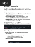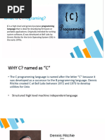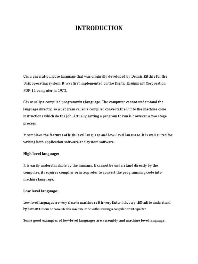 C is a general-purpose language that was originally developed by Dennis Ritchie for the Unix operating system. It was first implemented on the Digital Equipment Corporation PDP-11 computer in 1972. C is usually a compiled programming language. The computer cannot understand the language directly, so a program called a compiler converts the C into the machine code instructions which do the job. Actually getting a program to run is however a two stage process It combines the features of high-level language and low- level language. It is well suited for writing both application software and system software. High level language: It is easily understandable by the humans. It cannot be understand directly by the computer, it requires complier or interpreter to convert the programming code into machine language. Low level language: