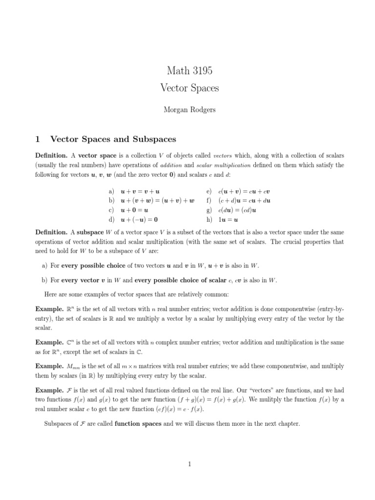 Denition. A subspace W of a vector space V is a subset of the vectors that is also a vector space under the same operations of vector addition and scalar multiplication (with the same set of scalars. The crucial properties that need to hold for W to be a subspace of V are: a) For every possible choice of two vectors u and v in W , u + v is also in W . b) For every vector v in W and every possible choice of scalar c, cv is also in W . Here are some examples of vector spaces that are relatively common: Example. Rn is the set of all vectors with n real number entries; vector addition is done componentwise (entry-byentry), the set of scalars is R and we multiply a vector by a scalar by multiplying every entry of the vector by the scalar. Example. Cn is the set of all vectors with n complex number entries; vector addition and multiplication is the same as for Rn , except the set of scalars in C. Example. Mmn is the set of all m n matrices with real number entries; we add these componentwise, and multiply them by scalars (in R) by multiplying every entry by the scalar. Example. F is the set of all real valued functions dened on the real line. Our vectors are functions, and we had two functions f (x) and g (x) to get the new function (f + g )(x) = f (x) + g (x). We mulitply the function f (x) by a real number scalar c to get the new function (cf )(x) = c f (x). Subspaces of F are called function spaces and we will discuss them more in the next chapter.