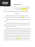 b and bet!een _________, o" _________, #ereina"ter $a%%ed t#e GRANTOR and _________, or it& &'$$e&&or, a& Tr'&tee, #ereina"ter $a%%ed t#e TRUSTEE( )ITNESSETH* )HEREAS, t#e Grantor #ereb irre+o$ab% tran&"er& and de%i+er& to t#e Tr'&tee $ertain in&'ran$e ,o%i$ie& de&$ribed in S$#ed'%e -A- #ereto [Link] to be #e%d in tr'&t/ and )HEREAS, t#e Grantor #a& irre+o$ab% tran&"erred to t#e Tr'&tee $ertain ot#er a&&et& a& &et "ort# in S$#ed'%e -A- #ereto [Link]/ NO), THERE0ORE, in $on&ideration o" t#e m't'a% $o+enant& and a1reement& $ontained #erein, it i& a1reed t#at t#e Tr'&tee &#a%% #o%d and admini&ter a%% a&&et& !#i$# ma $ome into t#i& tr'&t in a$$ordan$e !it# t#e term&, ,ro+i&ion& and $ondition& o" t#e !it#in Tr'&t A1reement( ARTICLE ONE( GENERAL 2ROVISIONS RELATING TO GRANTOR AN3 TRUSTEE A( Irre+o$abi%it * T#i& Tr'&t A1reement &#a%% be irre+o$ab%e, and neit#er t#e Grantor nor an ot#er ,er&on &#a%% #a+e t#e ri1#t or ,o!er to a%ter, amend or re+o4e an o" t#e term&, $ondition& or ot#er ,ro+i&ion& o" t#i& Tr'&t in !#o%e or in ,art( B( Ri1#t to Add 2ro,ert * T#e Grantor or an ot#er ,er&on ma at an time $a'&e additiona% rea% or ,er&ona% ,ro,ert to be added to t#e $or,'& o" t#i& Tr'&t b deed, inter +i+o& tran&"er, La&t )i%% and Te&tament or ot#er!i&e, and t#e Tr'&tee &#a%% #o%d, admini&ter and di&trib'te a%% &'$# additiona% ,ro,ert a$$ordin1 to t#e term& and $ondition& o" t#i& a1reement( C( 2o%i$ie& o" In&'ran$e* 1( T#e Tr'&tee i& #ereb +e&ted !it# a%% ri1#t, tit%e and intere&t in and to an ,o%i$ o" in&'ran$e !#i$# #a& been or !i%% be irre+o$ab% a&&i1ned to &aid Tr'&tee 5,'r&'ant to t#i& A1reement6, and i& a't#ori7ed and em,o!ered to [Link]$i&e and en8o , "or t#e ,'r,o&e& o" t#e tr'&t #erein $reated and a& ab&o%'te o!ner o" an ,o%i$ o" in&'ran$e, a%% o" t#e o,tion&, bene"it&, ri1#t& and ,ri+i%e1e& 'nder an ,o%i$ , in$%'din1 t#e ri1#t to borro! ',on and ,%ed1e &ame "or a %oan or %oan&( An in&'ran$e $om,an !#i$# #a& or !i%% i&&'e a ,o%i$ o" in&'ran$e !#i$# be$ome& ,art o" t#e tr'&t e&tate i& #ereb a't#ori7ed and dire$ted to re$o1ni7e t#e Tr'&tee a& ab&o%'te o!ner o" &aid ,o%i$ , "'%% entit%ed to a%% o,tion&, ri1#t&, ,ri+i%e1e& and intere&t& 'nder &'$# ,o%i$ , and an re$ei,t&, re%ea&e& and ot#er in&tr'ment& e.e$'ted b t#e Tr'&tee in $onne$tion !it# an ,o%i$ &#a%% be bindin1 and $on$%'&i+e ',on t#e in&'ran$e $om,an and ',on a%% ,er&on& intere&ted in t#i& tr'&t( T#e Grantor
