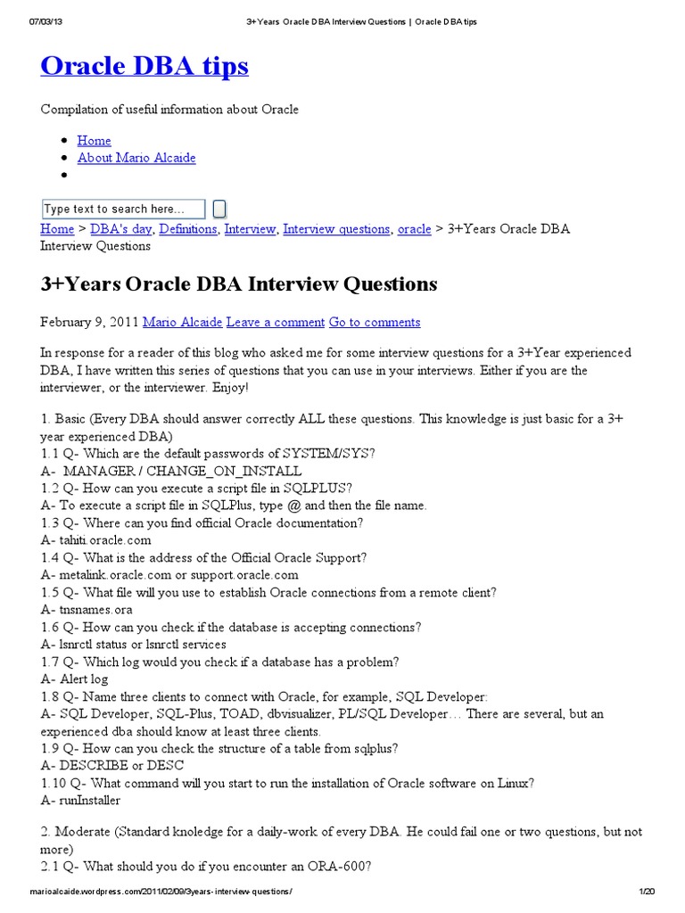 February 9, 2011 Mario Alcaide Leave a comment Go to comments In response for a reader of this blog who asked me for some interview questions for a 3+Year experienced DBA, I have written this series of questions that you can use in your interviews. Either if you are the interviewer, or the interviewer. Enjoy! 1. Basic (Every DBA should answer correctly ALL these questions. This knowledge is just basic for a 3+ year experienced DBA) 1.1 Q- Which are the default passwords of SYSTEM/SYS? A- MANAGER / CHANGE_ON_INSTALL 1.2 Q- How can you execute a script file in SQLPLUS? A- To execute a script file in SQLPlus, type @ and then the file name. 1.3 Q- Where can you find official Oracle documentation? A- tahiti.oracle.com 1.4 Q- What is the address of the Official Oracle Support? A- metalink.oracle.com or support.oracle.com 1.5 Q- What file will you use to establish Oracle connections from a remote client? A- tnsnames.ora 1.6 Q- How can you check if the database is accepting connections? A- lsnrctl status or lsnrctl services 1.7 Q- Which log would you check if a database has a problem? A- Alert log 1.8 Q- Name three clients to connect with Oracle, for example, SQL Developer: A- SQL Developer, SQL-Plus, TOAD, dbvisualizer, PL/SQL Developer There are several, but an experienced dba should know at least three clients. 1.9 Q- How can you check the structure of a table from sqlplus? A- DESCRIBE or DESC 1.10 Q- What command will you start to run the installation of Oracle software on Linux? A- runInstaller 2. Moderate (Standard knoledge for a daily-work of every DBA. He could fail one or two questions, but not more) 2.1 Q- What should you do if you encounter an ORA-600?