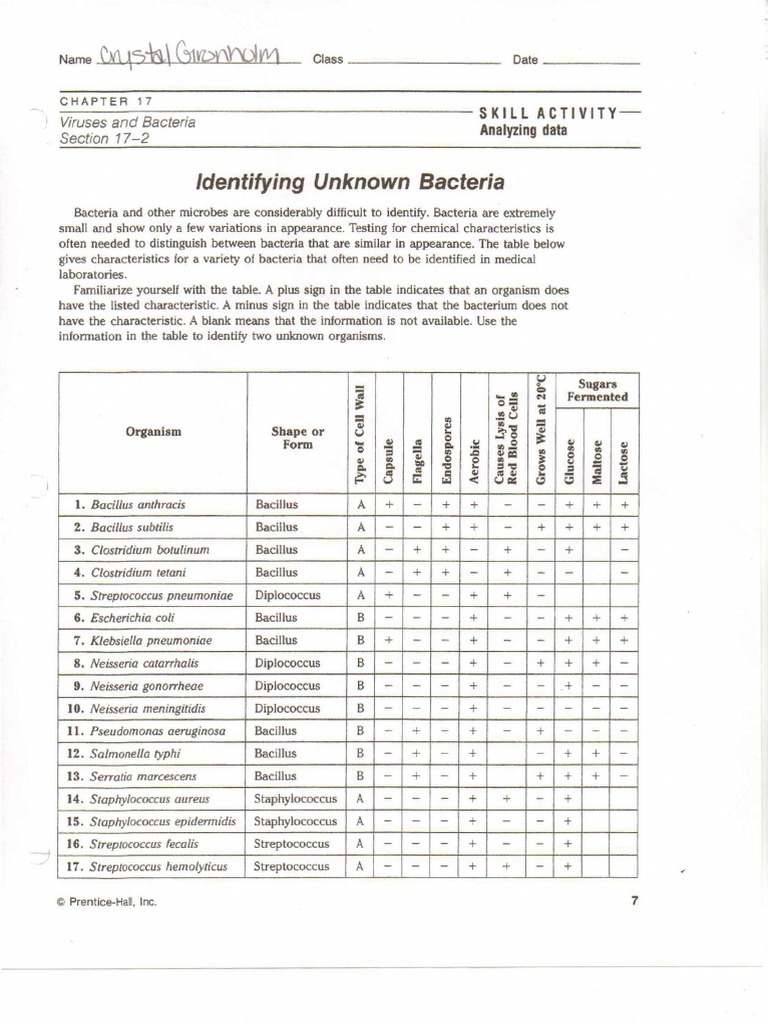 Bacteria and other microbes are considerably difficult to identify. Bacteria are extremely small and show only a few variations in appearance. Testing for chemical characteristics is often needed to distinguish between bacteria that are similar in appearance. The table below gives characteristics for a variety of bacteria that often need to be identified in medical laboratories. Familiarize yourself with the table. A plus sign in the table indicates that an organism does have the listed characteristic. A minus sign in the table indicates that the bacterium does not have the characteristic. A blank means that the information is not available. Use the information in the table to identify two unknown organisms.