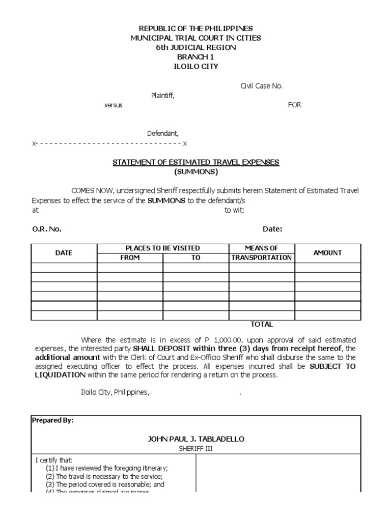 Defendant, x- - - - - - - - - - - - - - - - - - - - - - - - - - - - - - - x STATEMENT OF ESTIMATED TRAVEL EXPENSES (SUMMONS) COMES NOW, undersigned Sheriff respectfully submits herein Statement of Estimated Travel Expenses to effect the service of the SUMMONS to the defendant/s at to wit: O.R. No. DATE/TIME PLACES TO BE VISITED FROM TO Date: MEANS OF TRANSPORTATION AMOUNT