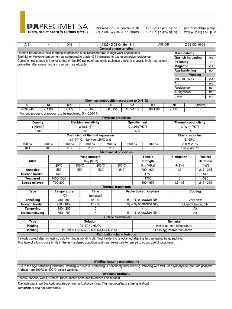 1.4122 - X 39 Cr Mo 17 1 AFNOR General characteristics Quench-hardenable ferro-martensitic stainless steel recommended in high wear applications.