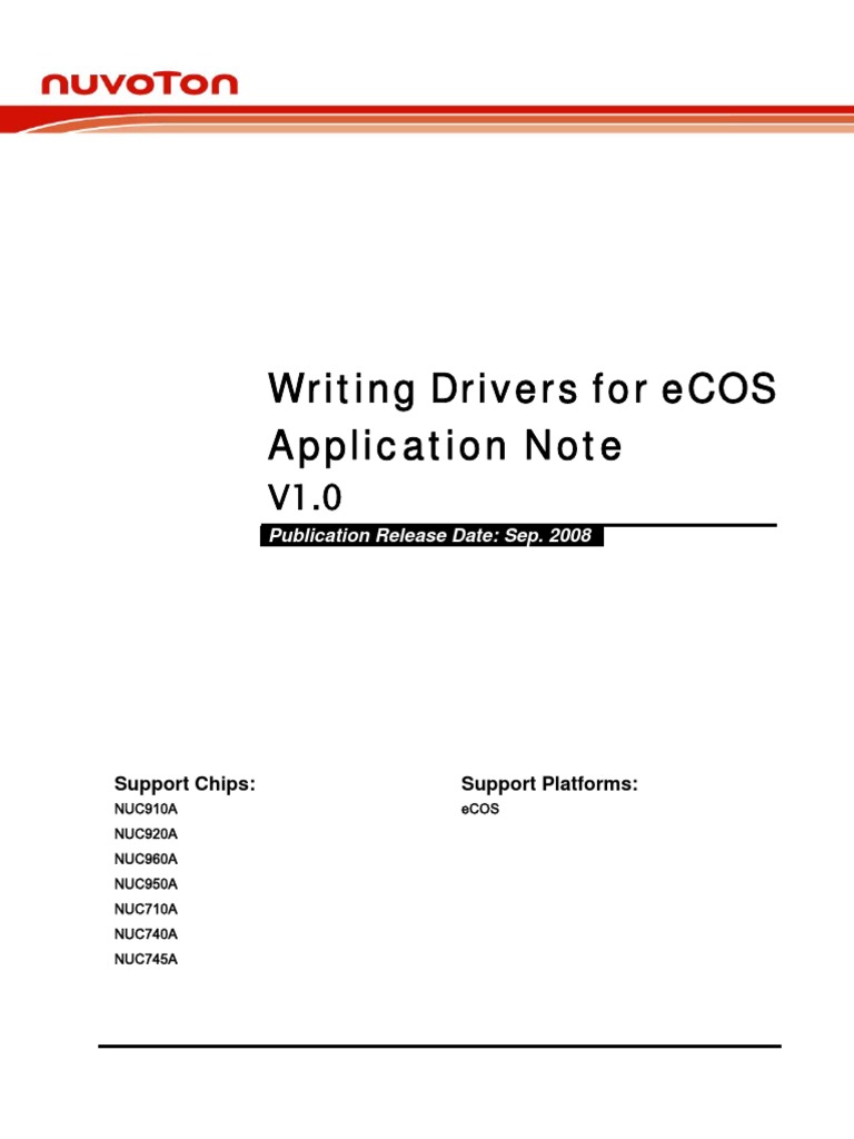 This document will introduce how to write a device driver for Nuvoton ported eCOS kernel. It includes the