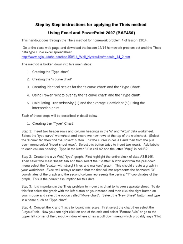 This handout goes through the Theis method for homework problem 4 of lesson 13/14. Go to the class web page and download the lesson 13/14 homework problem set and the Theis data type curve excel spreadsheet. http //www.agls.uidaho.edu/bae4!"/14#$ell#%ydraulics/module#14#&.htm The method is broken down into five main steps 1. 'reating the (Type chart) &. 'reating the (s curve chart)