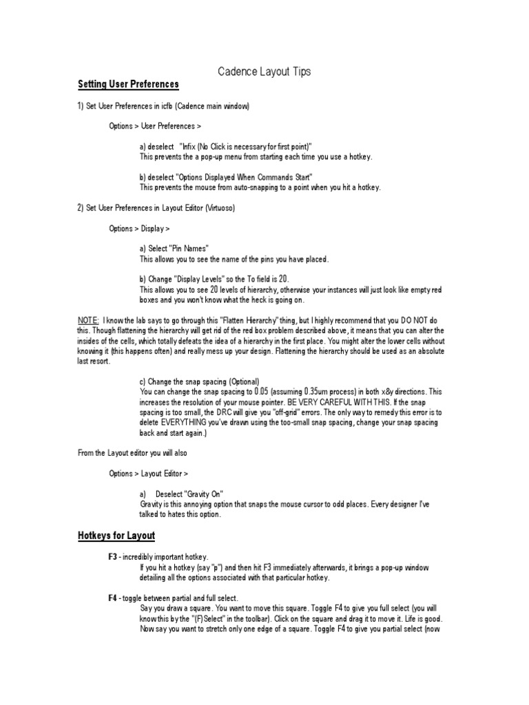 1) Set User Preferences in icfb (Cadence main window) Options > User Preferences > a) deselect "Infix (No Click is necessary for first point)" This prevents the a pop-up menu from starting each time you use a hotkey. b) deselect "Options Displayed When Commands Start" This prevents the mouse from auto-snapping to a point when you hit a hotkey. 2) Set User Preferences in Layout Editor (Virtuoso) Options > Display > a) Select "Pin Names" This allows you to see the name of the pins you have placed. b) Change "Display Levels" so the To field is 20. This allows you to see 20 levels of hierarchy, otherwise your instances will just look like empty red boxes and you won't know what the heck is going on. NOTE: I know the lab says to go through this "Flatten Hierarchy" thing, but I highly recommend that you DO NOT do this. Though flattening the hierarchy will get rid of the red box problem described above, it means that you can alter the insides of the cells, which totally defeats the idea of a hierarchy in the first place. You might alter the lower cells without knowing it (this happens often) and really mess up your design. Flattening the hierarchy should be used as an absolute last resort. c) Change the snap spacing (Optional) You can change the snap spacing to 0.05 (assuming 0.35um process) in both x&y directions. This increases the resolution of your mouse pointer. BE VERY CAREFUL WITH THIS. If the snap spacing is too small, the DRC will give you "off-grid" errors. The only way to remedy this error is to delete EVERYTHING you've drawn using the too-small snap spacing, change your snap spacing back and start again.) From the Layout editor you will also Options > Layout Editor > a) Deselect "Gravity On" Gravity is this annoying option that snaps the mouse cursor to odd places. Every designer I've talked to hates this option.