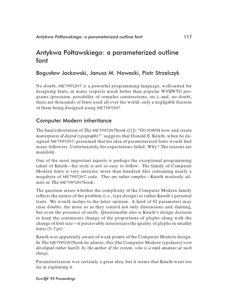 .The question arises whether the complexity of the Computer Modern familyreflects the nature of the problem (i.e., type design) or rather Knuth’s personaltraits. We would incline to the latter opinion. A herd of 62 parameters mayraise doubts, the more so as they control not only dimensions and slanting, but even the presence of serifs. Questionable also is Knuth’s design decisionto keep the continuous change of the proportions of glyphs along with thechangeoffontsize—it perceivablydeterioratesthequality ofglyphs insmallerfonts (5–7pt).Knuth was apparently aware of weak points of the Computer Modern design.In