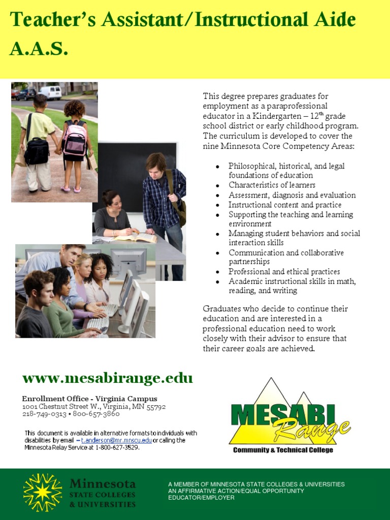 This degree prepares graduates for employment as a paraprofessional educator in a Kindergarten 12th grade school district or early childhood program. The curriculum is developed to cover the nine Minnesota Core Competency Areas: