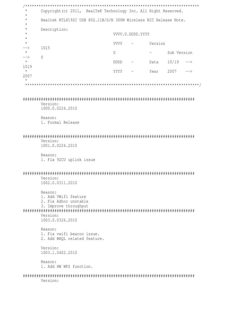 Realtek RTL8192C USB 802.11B/G/N 300M Wireless NIC Release Note.