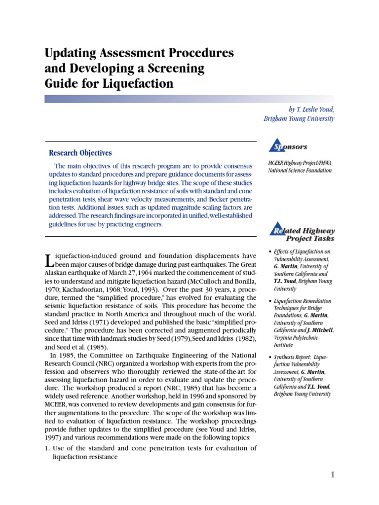Effects of Liquefaction on Vulnerability Assessment, G. Martin, University of Southern California and T.L. Youd, Brigham Young University Liquefaction Remediation Techniques for Bridge Foundations, G. Martin, University of Southern California and J. Mitchell, Virginia Polytechnic Institute Synthesis Report: Liquefaction Vulnerability Assessment, G. Martin, University of Southern California and T.L. Youd, Brigham Young University