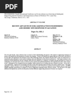 Several simplified procedures have been proposed for the use of field measurements of small-strain shear wave 0.6 velocity, VS , to assess liq0.25 < D50 (mm) < 2.0 M=7.5 FC (%) < 5 uefaction resistance of Y 0.5 e 20%10%3% granular soils. The advanCRR Curve tages of using VS are that 0.4 (1) it can be accurately Liquefaction measured in-situ using a No Liquefaction 0.3 number of techniques such as crosshole and 0.2 downhole seismic tests, the seismic cone penetration test, or spectral analy0.1 Field Performance Liq. No Liq. sis of surface waves, (2) Stark & Olson (1995) NCEER (1996) Suzuki et al. (1995b) Workshop measurements are pos0 sible in soils that are diffi0 50 100 150 200 250 300 Corrected CPT Tip Resistance, qc1N cult to penetrate with CPT and SPT, (3) measureI Figure 3. Recommendations for Calculating CRR and CPT ments can be performed Data Along with Empirical Liquefaction Data (after Youd in small laborator y